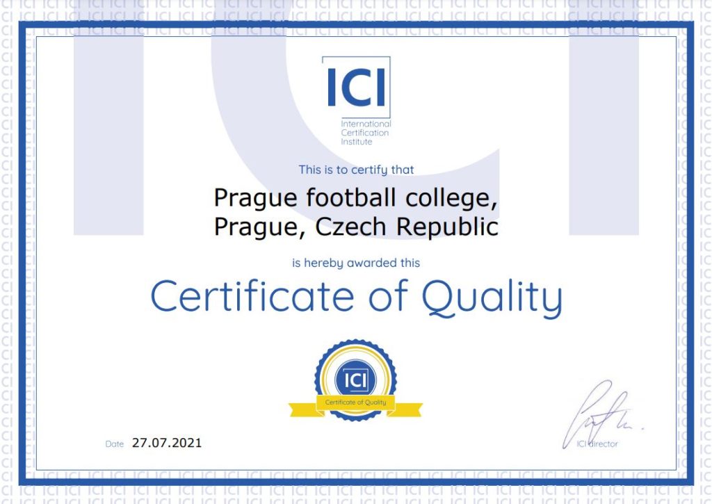 Mezinárodní certifikáty IES jsou vydávány od roku 1997 a za tu dobu získaly na globálním trhu práce významnou pozici. Certifikát doplňuje informaci o kvalitativní úrovni vzdělání na Prageu Football College a dává mu mezinárodní pečeť. Přílohou certifikátu je „Profil absolventa“, což je výpis klíčových kompetencí, které absolvent za dobu profesního studia na Prague Football College získal. Certifikát je vydáván v angličtině a češtině. Certifikát IES deklaruje před soukromými korporacemi v zahraničí i před orgány státní moci kompetenci jeho držiteli v daném oboru, jakož i oprávnění užívat profesní titul, který byl držiteli certifikátu IES udělen v zemi původu.